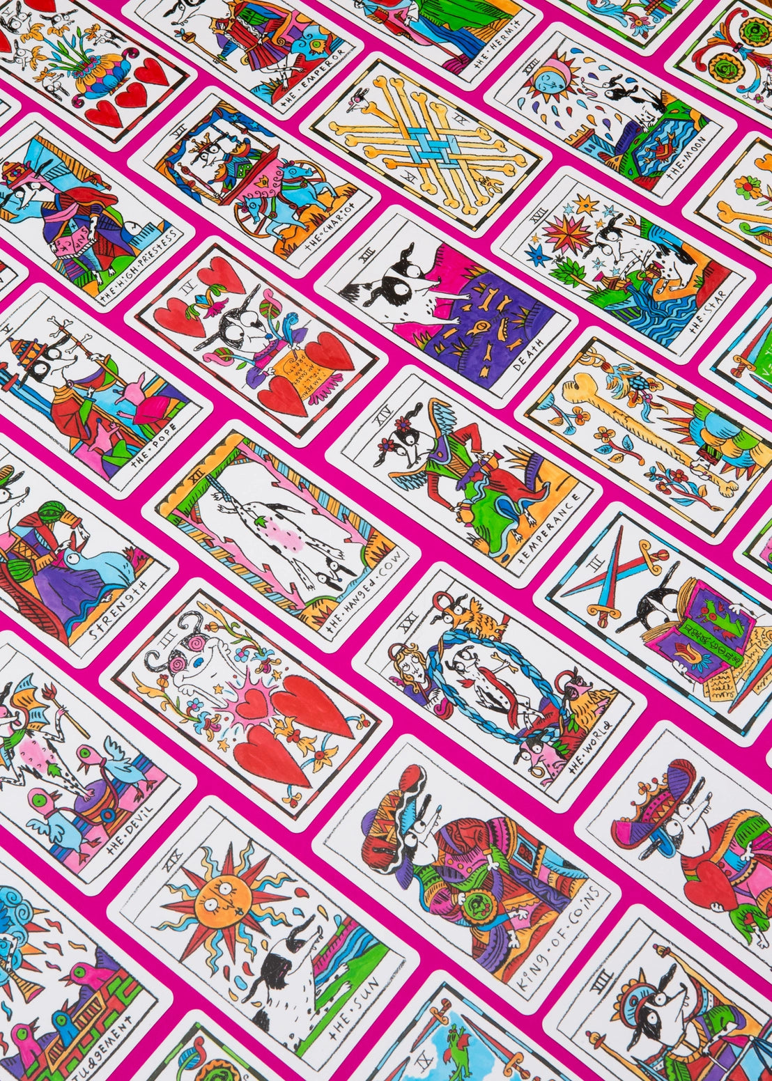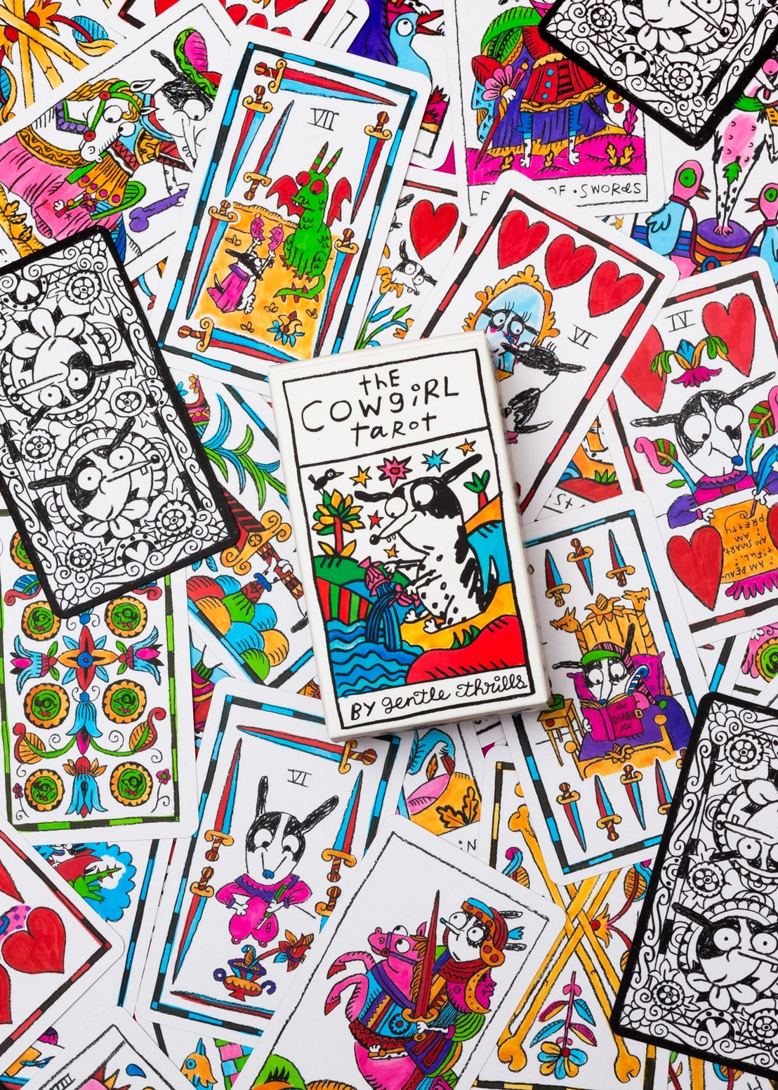 In irreverent homage to one of the most iconic decks of all time! Cowgirl is on her fool's journey (alongside her crab, duck, cat, pony, and bird friends). This full deck is comprised of major arcana, cups (represented as hearts), swords, batons (represented as bones), and pentacles. 78 cards in total. The original artwork for this deck was drawn & watercolored totally by hand and is reproduced in vivid color! The extra-thick cards in this deck measure the traditional 2.75" x 4.75" and are packaged in a matte finish tuck box with a foldout guide that shows each card's meaning. The boxed deck itself measures about 2" tall, so it's nice and chunky!