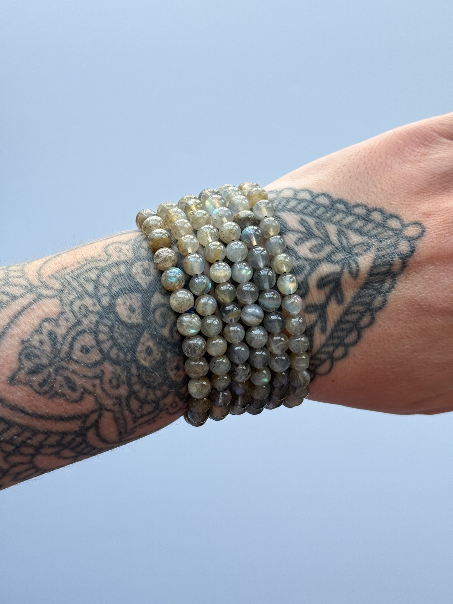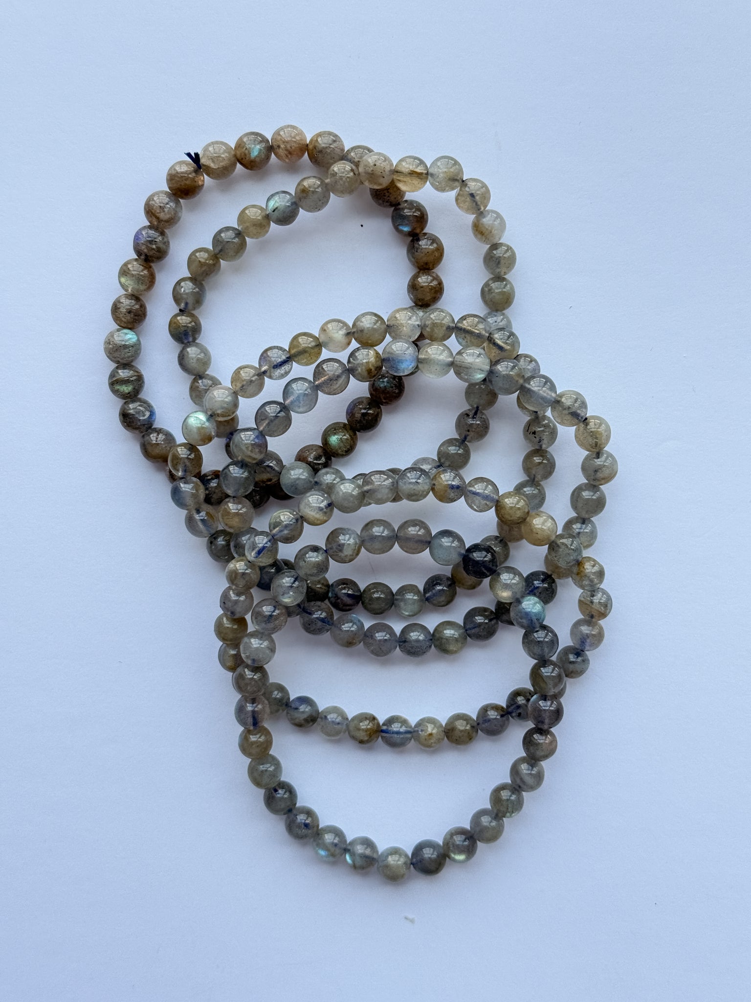 The crystal beads are made Labradorite