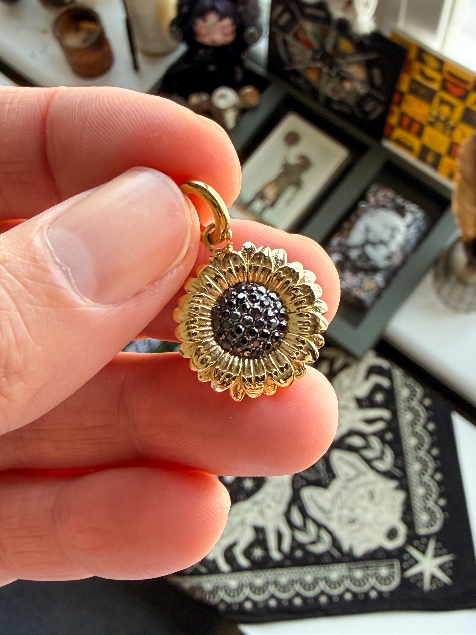 The Sunflower Charm features gold-tone stainless steel petals with faceted, black crystals at the center. Sunflowers are a symbol of loyalty and longevity, as they follow the sun's path from sunrise to sunset.