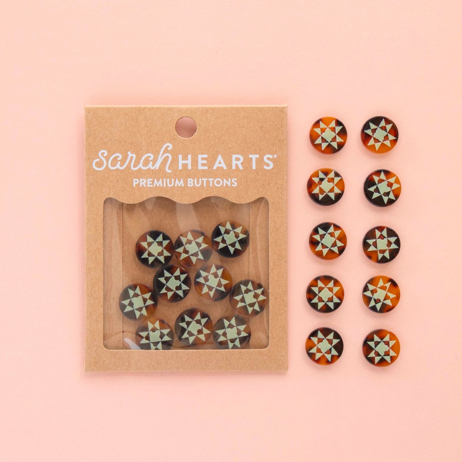 Add some quilty charm to your projects with these Large Quilt Star Buttons. Made from eco-friendly cellulose acetate, each button features a round tortoise shell design topped with a crafty cream printed quilt star. They're the perfect cheerful accent to brighten up any garment or bag. Sold in packs of 6 buttons